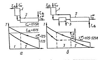 На рис. 7 б показана двоступінчаста схема включення високотемпературного рекуператора (1–2) із проміжним тепловою ланкою (3), що прохолоджує продукти згоряння на