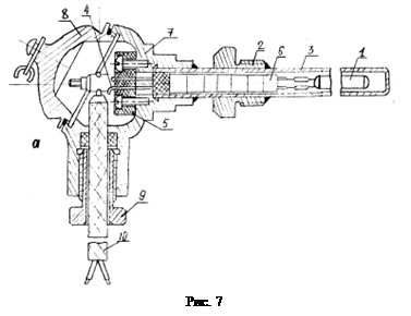 На (рис. 14б) показано устройство телескопа ПСИ. Он включает: корпус 1 с диафрагмой 7; объектив, имеющий стеклянную или кварцевую линзу 2, устанавливаемую во втулке 13, ввинчиваемой в корпус; блок термобатареи, состоящей из самой термобатареи 3, корпуса 5, отростка, на который навинчивается подвижная диафрагма 6, и контактных винтов 10; компенсационное медное сопротивление 4, шунтирующее термобатарею и обеспечивающее уменьшение влияния измерений температуры телескопа на показания пирометра; окуляр, включающий линзу 8 и защитное стекло 9. Фланец 11 служит для крепления корпуса к защитной арматуре, обеспечивающей работу пирометра в тяжелых условиях металлургического производства.