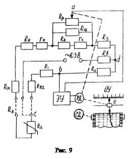 , включенные в измерительную схему вторичного регистрирующего прибора – логометра. Разность падений напряжений на сопротивлениях подается на вход усилителя 5, выходной сигнал которого поступает на реверсивный двигатель 6, перемещающий движок реохорда R2