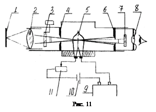 Изображения излучателя 1 линзой 2 и диафрагмой 4 объектива пирометра фокусируется в плоскости нити накаливания лампы 5. Оператор через диафрагму 6 линзу 8 окуляра и красный светофильтр 7 на фоне раскаленного тела видит нить лампы. Перемещая движок реостата 11, оператор изменяет силу тока, проходящего через лампу, и добивается уравнивания яркости нити и яркости излучателя. Если яркость нити меньше яркости тела, то она на его фоне выглядит черной полоской, при большей температуре нити она будет выглядеть, как светлая дуга на более темном фоне. При равенстве яркости излучателя и нити последняя "исчезает" из поя зрения оператора. Этот момент свидетельствует о равенстве яркостных температур объекта измерения и нити лампы. Питание лампы осуществляется с помощью батареи 10. Прибор 9, фиксирующий силу тока, протекающего в измерительной цепи, заранее проградуирован в значениях зависимости между силой тока и яркостной температурой АЧТ, что позволяет производить считывание результата в 0 С.
