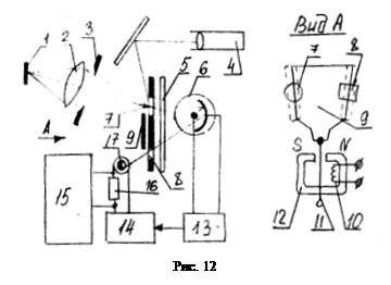 На (рис. 12)приведена схема фотоэлектрического пирометра, относящегося ко второй группе пирометров. В нем в качестве приемника излучения применяется фотоэлемент. Поток от излучателя 1 линзой 2 и диафрагмой 3 объектива фокусируется на отверстии 7 в держателе светофильтра 5 таким образом, чтобы изображение визируемого участка поверхности излучателя перекрывало данное отверстие. В этом случае величина светового потока, падающего на катод фотоэлемента 6, расположенного за светофильтром, определяется яркостью излучателя, т. е. его температурой. В держателе светофильтра расположено еще одно отверстие 8, через которое на фотоэлемент попадает поток от лампы обратной связи 17. Световые потоки от излучателя 1 и лампы 17 подаются на катод попеременно с частотой 50 Гц, что обеспечивается с помощью вибрирующей заслонки 9. Возвратно-поступательное движение заслонки обеспечивается с помощью катушки возбуждения 10 и постоянного магнита 12. В вибраторе происходит перемагничивание стального якоря 11, который с частотой 50 Гц поочередно притягивается полюсами магнита 12 и перемещает заслонку 9.