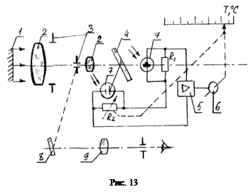 Интерференционный фильтр 4 является полупрозрачным зеркалом, имеющем высокий коэффициент пропускания в одной и высокий коэффициент отражения в другой области спектра. Зеркало 8 и окуляр 9 обеспечивают визуальную наводку объектива пирометра на объект измерения. Для уменьшения погрешности от влияния окружающей температуры фильтр 4 и приемники излучения 7 помещены в термостат.