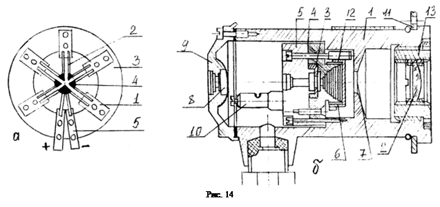 Датчик пирометра выполняется в виде телескопа, линза объектива которого фокусируется на термочувствительном приемнике излучения нагретого тела. В качестве термочувствительного элемента используются термопары, термобатареи, болометры (металлические и полупроводниковые), биметаллические спирали и т. п. Наиболее широко применяются термобатареи (рис. 14 а), в которых используется 6-10 миниатюрных термопар (например, хромель-копелевые), соединенных последовательно. Поток излучения попадает на расклепанные в виде тонких зачерненных лепестков рабочие концы 4 термопар 2. Свободные концы термопар привариваются к тонким пластинкам 1, закрепленным на слюдяном кольце 3. Металлические выводы 5 служат для присоединения к измерительному прибору, в качестве которого обычно используются потенциометры или милливольтметры.