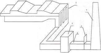 Рис.2 Схема дымового тракта методической печи: l-печь; 2-вертикальные каналы; 3-рекуператор; 4-боров; 5-шибер; 6 - труба дымовая.