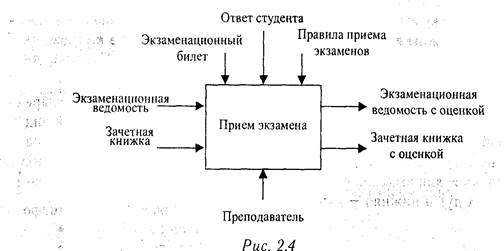 Пример. Процесс приема экзамена. Задача этой функции заключается в том, чтобы поставить оценки в экзаменационную ведомость и зачетную книжку. В качестве "механизма" здесь выступает преподаватель, который руководствуется содержанием экзаменационного билета, ответом студента и правилами приема экзаменов.
