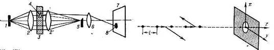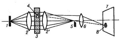 В т. м. пучок лучей от точечного или щелевого источника света 1 (рис.) линзой или системой линз и зеркал (2–2') направляется через исследуемый объект (3) и фокусируется на непрозрачной преграде (5) с острой кромкой (на т. н. ноже Фуко), так что изображение источника проектируется на самом краю преграды. Если в исследуемом объекте нет оптич. неоднородностей, то все идущие от него лучи задерживаются преградой. При наличии оптич. неоднородности (4) лучи будут рассеиваться ею и часть их, отклонившись, пройдёт выше преграды. Поставив за ней проекционный объектив (6) или окуляр, можно на экране (7) получить изображение неоднородностей (8) или наблюдать их визуально. Иногда вместо точечного источника света и ножа Фуко применяют оптически сопряжённые решётки (растры), перекрывающие ход лучам при отсутствии на их пути неоднородностей. Применяются также решётки со щелями в виде цветных светофильтров, позволяющие нагляднее определять характер оптич. неоднородностей. Получение более грубой (теневой) картины зон резкого изменения оптич. плотностей объекта возможно без перекрытия лучей ножом Фуко или решётками. Просвечивание объекта двумя оптич. системами, установленными под углом друг к другу, позволяет получать стереоскопич. картину распределения неоднородностей в объекте.