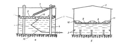 Рис.5 . Схема устройства резервуаров с плавающей крышей (а) и понтоном (б):