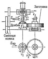 Нарезание шевронных зубчатых колес осуществляют на горизонтальных станках двумя спаренными косозубыми долбяками с правым и левым наклоном зуба. Долбяки работают попеременно. Если один из них производит обработку до середины ширины зубчатого венца, другой в это время перемещается обратно и наоборот, образуя таким образом шевронный зуб.