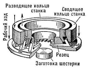 Одновременное нарезание всех зубьев резцовыми головками осуществляется на специальных зубодолбежных станках для обработки прямозубых цилиндрических колес внешнего и внутреннего зацепления, шлицев, зубчатых муфт и копиров сложной формы методом копирования.