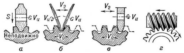 Черновое нарезание методом врезания является наиболее простым и экономичным. При этом методе движение обкатки отсутствует, подачу в направлении режущего инструмента совершает стол с заготовкой. Черновое нарезание осуществляют обычно на 0,1-0,3 мм глубже теоретической высоты зуба, что позволяет устранить возможность касания вершинами чистовых резцов дна впадины зуба и тем самым улучшить их резание.