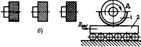 На рис. 5, а приведена схема накатывания рифленой поверхности. Заготовку закрепляют на токарном станке, на суппорте которого установлена державка с одним или двумя накатными роликами. Ролики внедряются в поверхность заготовки (D s п) и перемещаются вдоль заготовки с движением Ds пр. Вид рифлений (рис. 5, б) определяется характером зубчиков на роликах. Крестовое рифление производят двумя роликами, один из которых имеет правое направление отпечатывающих зубчиков, а другой - левое. Оба ролика вращаются на осях самоустанавливающейся державки. Для накатывания клейм (рис. 5, в) на накатнике J располагают негативно выступающие знаки. Заготовку 2 устанавливают на ролики для более легкого перемещения в момент накатывания.