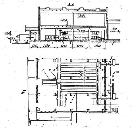 Рис. 1. Компоновка склада тары и продукции молочного комбината: 1 - приемные цепные накопители для порожней тары; 2 - штабеле-ры для перемещения и штабелирования порожней тары - оборудования; 3 - пути штабелеров; 4 - цепные толкающие конвейеры в складе посуды (двухярусные) и в складе продукции (трехярусные); 5-конвейерные коммуникации в цехе розлива