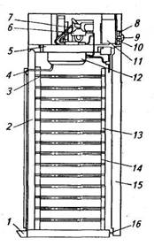 Рис. 2. Холодильный шкаф ШХ-1,40К:1 — Поллом для талой волы; 2 — корпус шкафа; 3— поддон воздухоохладителя; 4— трубка отвода талой воды; 5 — теплоизолированная плита; 6 — терморегулирую-1ШШ вентиль; 7—холодильный агрегат; 8— щит управления и сигнализации; 9—сигнальная лампа; 10 — манометрический термометр; 11 — щит электрооборудования; 12— воздухоохладитель; 13— опорные скобы для функциональных емкостей; /-/—емкость; 15 — дверь; 16— уплотнение дверей.