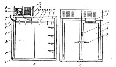 Рис.3. Сборная низкотемпературная камера КХН-1-8,0: о —разрез; б— вид спереди: / — панель пола; .2—боковая панель; 3 — за* ( к двери; 4— дверь: 5 — лампа; б—панель двери; 7—шкаф электрооборудования; 8 — термо; егулируюшмй вентиль; 9 —холодильный агрегат; 10— воздухоохладитель; /7 —короб; /2—отражатель; 13 — труба; 14— крюк; 75 —панель потолка; /6—решетка-полка; /7—ограждение холодильногоагрегата; 18— щит управления