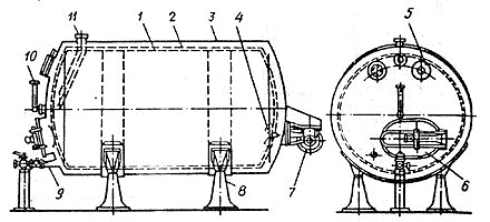 1 - рабочий резервуар; 2 - теплоизоляция; 3 - кожух; 4 - мешалки; 5 - смотровое окно; 6 - люк; 7 - мешалки; 8 - опорные ножки; 9 - сливной патрубок; 10 - термометр; 11- наливная труба