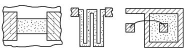 Наиболее распространённой является конструкция резисторов прямолинейной формы рис.3.3а, как наиболее простая в конструктивном и технологическом решении. Прямолинейная форма обеспечивает большую чёткость контура, высокую механическую жёсткость масок, более простую топологию, поэтому лучше отдавать предпочтение этому типу резисторов. Если расчётная длина резистора оказывается большой и не может быть размещена на подложке в одну линию, то его выполняют сложной формы в виде меандра рис.3.3б . Резисторы типа «меандр» применяют для получения высокоомных резисторов. Для изготовления низкоомных сопротивлений, применяют резисторы типа квадрат рис.3.3в.