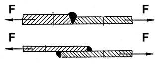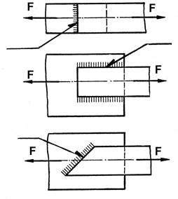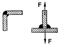 В зависимости от выбранного вида сварки и требований, предъявляемых к соединению, применяют различные виды соединений. В зависимости от взаимного расположения соединяемых элементов различают следующие виды сварных соединений: стыковые (рис. 2, а), нахлесточные (рис. 2, б), угловые (рис. 2, в) и тавровые (рис. 2, г). Форму кромок и размеры поперечного сечения стыковых швов определяют в зависимости от толщины свариваемых деталей и способа сварки. Угловые швы в поперечном сечении имеют форму прямоугольного треугольника. В зависимости от расположения по отношению к направлению нагрузки сварные швы делят на лобовые – шов перпендикулярен направлению нагрузки (рис. 2, д), фланговые – шов параллелен направлению нагрузки (рис. 2, е), косые и комбинированные (рис. 2, ж).