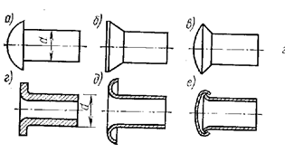 Стальные заклепки применяют для прочных соединений, а латунные и алюминиевые – для соединений, не требующих большой механической прочности. Для соединения деталей, изготовленных из хрупких или неметаллических материалов, используют полупустотелые и пустотелые заклепки (рис. 4, д, е).