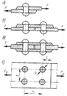 Заклепочные соединения выполняют внахлестку (рис. 5, а) или встык с одной (рис. 5, б) или двумя (рис. 5, в) накладками и расположением заклепок в один, два или более параллельных (рис. 5 г) или шахматных ряда.