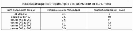 Светофильтры следует подбирать с учетом применяемой силы тока по данным таблицы 1.