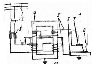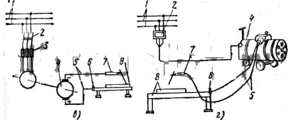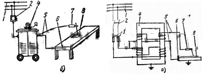 На рисунке, а показана принципиальная электрическая схема поста для ручной дуговой сварки переменным током (от трансформатора типа ТС), а на рисунке б - общий вид такого поста. От сети 1 переменный ток напряжением 220 или 380 В через рубильник 2 и предохранители 3 подается к источнику питания - сварочному трансформатору 4, где ток трансформируется до напряжения 60-75В, необходимого для возбуждения дуги, и по сварочным проводам 5 через зажим 6 и электрододержатель 7 подводится к изделию 8.