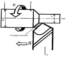 Движения резания при точении. На рис. 2 схематически показано обтачивание детали 1 резцом 2. Деталь при этом вращается по стрелке υ, а резец перемещается по стрелке s и снимает с детали стружку. Первое из этих движений является главным . Оно характеризуется скоростью резания. Второе движение - движением подачи .