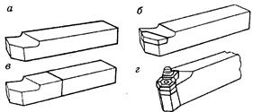 Рисунок 10. Типы токарных резцов по конструкции: цельные (а, б) составные с припаянными (в) или с механическим креплением (г) пластинами.