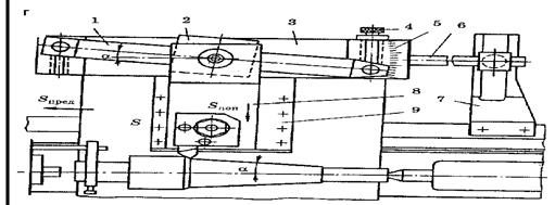 Рисунок 21. Способы обтачивания конусов: а - широким резцом, б- поворотом верхнего суппорта, в -смещением корпуса задней бабки; г - с помощью конусной линейки, 1- поворотная линейка, 2 - ползушка, 3 - неподвижная линейка, 4 - винт, 5 - шкала, 6- тяга, 7 - кронштейн, 8 -салазки, 9 –корпус; где D u d - диаметры обрабатываемых конических поверхностей, мм; L - высота конуса, мм.