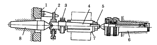 Рисунок 22. Обработка в центрах: 1 -поводковый патрон, 2 — хомутик, 3 - гайка, 4 -стержень, 5 -гайка, 6 - вращающийся центр, 7 - втулка, 8 - передний центр