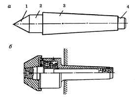 Рисунок 23. Токарные центры: а — простой центр (1 — конус, 2 — шейка, 3 — конус, 4 — хвостовик); б — обратный центр