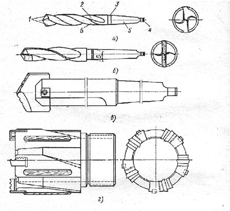 Рисунок 1. Сверла: а – цилиндрические с винтовой канавкой и коническим хвостовиком, б – цилиндрические с пластинкой ВК8, в – перовые для глубоких отверстий, г- полые для кольцевого сверления отверстий