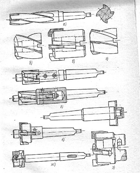 Рисунок 2. Зенкеры: а- цилиндрические с винтовой канавкой и пластинками ВК8, б- насадной, цельный, в - насадной со вставными ножами, г —насадной с ножами ВК8 и Т15К6, д - целый и съемный для цилиндрических углублений, е— пластинчатый и со вставными ножами для обработки торцов, ж— обратные зенковки с ножами ВК8 и Т15К6 и штифтовым замком, 3— специальный для борштанг
