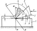 Под действием силы Р резец 2 в виде клина, передней плоскостью 3 вдавливается в верхний слой материала детали 1 и подвергают его упругой и пластической деформации. Затем, преодолев внутренние силы связи, резец отрывает частицы материала от основной массы путем сдвига по плоскости NN. При движении резца под действием силы Р процесс сдвига совершается непрерывно и с обрабатываемой поверхности удаляется слой материала толщиной z в виде стружки. Плоскость стружки NN и обрабатываемая поверхность расположены под углом ∆, который зависит от физико-механических свойств материала детали и колеблется в пределах 145 - 155о . В процессе резания слой металла, прилегающий к обрабатываемой поверхности, упрочняется и при этом изменяется микро- и макроструктура верхнего слоя, повышается твердость, в нем возникают внутренние напряжения. В верхнем слое обнаруживаются макро- и микротрещины, что приводит к ухудшению физико-механических свойств (образуется дефектный слой на глубине от десятых долей микрометра до десятых долей миллиметра).