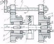 Между двумя обкатниками 1 и 4, установленными соосно, расположена резцовая головка 8. Обкатники приводятся во вращение посредством зубчатых венцов 7, которые зацепляются с зубчатыми колесами 2, установленными на приводном валу 3. Деформирующие ролики 5, размещенные в обкатниках, вращаются в результате фрикционного взаимодействия с опорными конусами 6.
