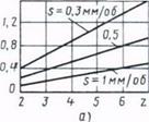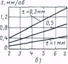 Рис. 2. Зависимости глубины t резания (а) и подачи S (б) от числа Z роликов в обкатнике (