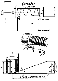 Вершина резца при перемещении с постоянной подачей вдоль вращающейся заготовки при резании оставляет на ее поверхности винтовую линию. Наклон винтовой линии к плоскости, перпендикулярной оси вращения заготовки, зависит от частоты вращения шпинделя с заготовкой и подачи резца и называется углом m подъема винтовой линии. Расстояние между винтовыми линиями, измеренное вдоль оси заготовки, называется шагом Р винтовой линии. Если отрезок на поверхности детали, равный шагу винтовой линии, развернуть на плоскость, то из прямоугольного треугольника АБВ можно определить tgm=P/pd, где d-диаметр заготовки с винтовой линией. При углублении резца в поверхность заготовки вдоль винтовой линии образуется винтовая поверхность, форма которой соответствует форме вершины резца. Резьба – винтовая поверхность, образованная на телах вращения и применяемая для соединения, уплотнения или обеспечения заданных перемещений деталей машин и механизмов. Резьбы подразделяются на цилиндрические (образованные на цилиндрических поверхностях) и конические (образованные на конических поверхностях). В зависимости от назначения резьбового соединения применяют резьбы различного профиля. Профилем резьбы называется контур сечения резьбы в плоскости, проходящей через ее ось. Широко применяются резьбы с остроугольным, трапецеидальным и прямоугольным профилями.