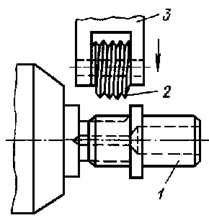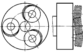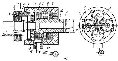 Получение резьбы накатыванием осуществляется копированием профиля накатного инструмента путем его вдавливания в металл заготовки. На токарных, токарно-револьверных станках и станках-автоматах накатывают резьбы диаметром 5–25 мм одним роликом (рисунок слева). Резьбу накатывают при вращении заготовки в патроне или цанге и при поступательном перемещении суппорта станка вместе с накатником 3, в который вмонтирован накатной ролик 2. При этом необходимо следить за величиной деформации заготовки под действием односторонней радиальной силы. Накатывание резьбы диаметром до 50 мм происходит в более благоприятных условиях при применении резьбонакатных головок (рисунок справа) с тремя и более роликами.