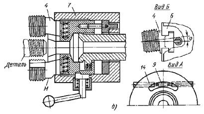 При нарезании наружной резьбы большее распространение получили головки с круглыми гребенками, так как они просты по конструкции, позволяют работать с большим числом переточек и обладают большей стойкостью, чем радиальные и тангенциальные гребенки. Устройство и работа винторезных головок имеют незначительные различия. В приведенной на рисунке ниже конструкции винторезной головки нарезание наружной резьбы производят круглыми резьбонарезными гребенками 2 с кольцевой нарезкой, которые устанавливают выточкой 3 на кулачках 4 равномерно по окружности на равном расстоянии от центра, зависящем от диаметра нарезаемой резьбы, и крепят винтами 1. Опорная поверхность кулачков обеспечивает угол наклона j витков резьбонарезных гребенок, а также смещение витков соседних гребенок на 1/Z шага резьбы, где z – число гребенок. Пружинами 5 через штифты 13 кулачки 4 прижимаются к обойме 7, которая посредством рукоятки 12 может перемещаться вдоль корпуса 6. В рабочем положении, рисунок – а) резьбонарезные гребенки сведены, так как кулачки 4 своими выступами М упираются в обойму 7. Наладку резьбонарезных гребенок на размер производят или по годной готовой детали, или по проходному рабочему резьбовому калибру, которые устанавливают в рабочую зону. Изменение размера производят поворотом кольца 9 винтами 14. Вместе с кольцом 9 посредством штифта 8 поворачивается корпус 6 с кулачками 4, которые, перемещаясь по скошенным поверхностям Г обоймы 7, удаляются или приближаются к оси головки. На станок резьбонарезную головку устанавливают и закрепляют хвостовиком 10. Зазор между корпусом 6 и хвостовиком 10 выбирается пружиной 11. Резьбу нарезают с принудительной подачей головки, равной шагу нарезаемой резьбы. Можно нарезать резьбу и головкой, перемещающейся самозатягиванием. На определенном расстоянии до конца рабочего хода подача прекращается и головка останавливается. При этом останавливаются хвостовик 10 и обойма 7, а корпус 6, увлекаемый резьбой детали, продолжает перемещаться. В результате выступы М кулачков 4 выходят из обоймы 7 и кулачки вместе с гребенками 2 под действием пружин 5 расходятся, освобождая обрабатываемую деталь. Возврат резьбонарезных гребенок в исходное положение, а также остановку процесса обработки резьбы производят поворотом рукоятки 12.