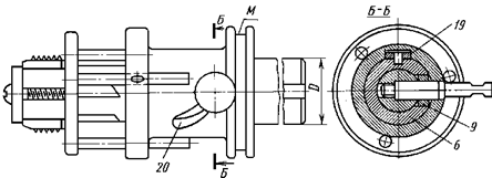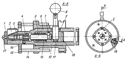 Внутреннюю резьбу чаще нарезают резьбонарезными головками с призматическими гребенками, режущие кромки которых располагаются на одном диаметре и имеют заходный конус. Число гребенок в комплекте зависит от размера головки. Гребенки смещены в комплекте относительно друг друга в соответствии с углом подъема винтовой линии нарезаемой резьбы. Гребенки 2 (рисунок ниже) расположены в радиальных пазах корпуса 6 резьбонарезной головки, торец которого закрыт фланцем 1. Гребенки 2 могут перемещаться по конической части втулки 4, в результате чего изменяется расстояние от оси головки до рабочей части гребенки. Втулка 4 связана с тягой 5 и перемещается внутри корпуса 6 (вдоль оси) с сердечником 10 под действием пружины 13 или от рукоятки 11 с шаровым наконечником 8. Тяга 5 связана с втулкой резьбовым соединением, а с сердечником 10 – проточкой, в которую входит стопор 7. Корпус 6 имеет паз, по которому перемещается рукоятка 11. Наладку резьбонарезной гребенки на размер производят по рабочему резьбовому калибру, по эталонной детали или по кольцу, внутренний диаметр которого равен наружному диаметру резьбы. Наладку на размер резьбонарезных гребенок производят при снятых фланце 1 и стопоре 17. В освободившееся отверстие на шлицы 3 вставляют торцовый ключ, которым поворачивают по резьбе тягу 5 внутри втулки 4. Последняя удерживается от вращения стопором 16, который входит в осевой паз. Вращая тягу 5, можно выдвигать или убирать внутрь корпуса 6 коническую часть втулки 4. При этом гребенки 2 или выдвигаются, увеличивая наружный диаметр резьбы, или сдвигаются к оси головки, уменьшая диаметр резьбы. Автоматическое отключение головки при окончании нарезания резьбы производится кольцом 15, которое упирается в торец детали. Кольцо 15 устанавливают на нужный размер, перемещая на стержнях 14 относительно муфты 9, и фиксируют в нужном положении стопорами 18 в корпусе 12. Муфта 9 выполнена подвижно вдоль корпуса 6, а от проворота удерживается шпонкой-роликом 19. При окончании нарезания резьбы кольцо 15 упирается в торец детали и муфта 9 останавливается. Корпус 6 продолжает перемещаться и фигурный паз 20 муфты 9 поворачивает рукоятку 11 и выводит ее из прямого участка на фигурный участок паза в корпусе 6, направленный в сторону хвостовика. При этом пружина 13 смещает сердечник 10 вместе с клином 4 в сторону хвостовика, сводит гребенки к оси головки и выводит их из резьбы, что позволяет быстро отвести головку в исходное положение.
