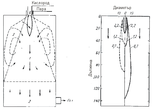 Производство на водород по метода на паро-кислородна газифика-ция на нефтените остатъци се осъществява и без котел-утилизатор. В този случай газа се охлажда за сметка на впръскване на вода в количество, осигуряващо също и очистване от сажди.Наситеният на водни пари газ, съдържащ серни съединения, постъпва за среднотемпературна конверсия на въгледороден оксид. След конверсията на СО, газа се очиства от СО2 и сероводород. Процесът се води при налягане 11 – 17 МРа. Газът, постъп-ващ за очисване е с парциално налягане на СО2 от 3,6 до 5,8 МРа и на сероводород от 0,011 до 0,17 МРа.
