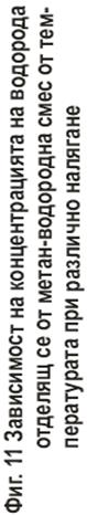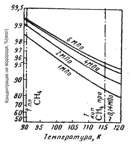 Отделяне на водорода от негови смеси с газообразни въглеводоро-ди чрез метода на фракционна кондензация се провежда с охлаждане на газовата смес до температури, при които въглеводородите преминават в течно състояние, а водородът остава в газообразно. Разделянето се осно-вава на разлики в парциалните налягания на водорода и въглеводороди-те. Концентрирането на водорода представява по същество задача свър-зана с отделянето на водорода от метана, доколкото другите въглеводоро-ди кондензират при по-високи температури от метана. Равновесието на системата водород – метан се определя от режимните условия по темпе-ратура, необходими за получаване на водород с необходимата степен на чистота. На фигура 11 е показана зависимостта на концентрацията на по-лучавания водород от температурата при различни налягания. Конденза-цията на метана се води при 2 – 6 МРа. Както се вижда от фигурата, водо-род с концентрация 95% може да се получи при налягане 2 МРа и темпе-ратура минус 166 0 С, а при 6 МРа – при температура минус 158 0 С. За по-лучаване на водород с по-восока концентрация е необходима по-ниска температура.