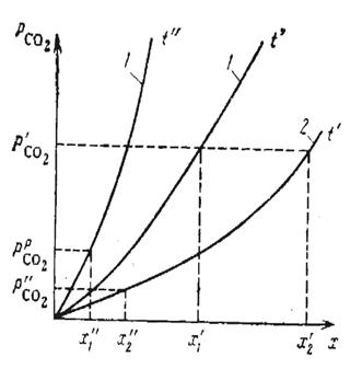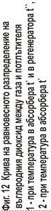 Кривата на разпределение, тоест зависимостта на количеството на газа, погълнато от течността, от парциалното налягане на газа на течност-та pCO 2 , pH 2 S се опледеля за всеки поглътител експериментално. Общият характер на кривите на разпределение е показан на фигура 12, от която е видно, че поглътителя имащ крива на разпределение 1 е по-малко ефек-тивен от този с крива на разпределение 2, тъй като неговата поглъща-емост при едно и също парциално налягане. За достигане на тази степен на очистка регенерацията на поглътител 1 трябва да е по-дълбока (х``1 <x``2 ). Подгряването на поглътителя в регенератора до t``1 позволява да се достигне необходимата дълбочина на регенерация х``1 при по-висо-ко парциално налягане на СО2 в регенератора и да се създадат условия, при които парциалното налягане на СО2 по-високо от равновесното, тоест рр СО2 >р``СО2 .