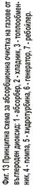 Принципната схема на абсорбционна очистка на газа от СО2 и Н2 S с нагряване на поглътителя в процеса на регенерация е показана на фигура 13. Газът се въвежда в абсорбер 1 отдолу и след очистване излиза отгоре. Регенерираният поглътител с температура t1 , близка до температурата на върха на абсорбера, се подава отгоре. Поглътителят, наситен на въглеро-ден диоксид, се извежда от абсорбера и преминава през топлообменник 3, където се подгрява за сметка на топлината на регенерирания поглътител. Ако процесът протича при по-високо налягане, отколкото налягането в регенератор 6, то понижаване налягане на поглътителя се извършва, като го прекарват през турбина 5; при това от поглътителя се отделя част от СО2 .