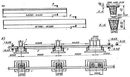 При шаге колонн 6 м железобетонные фундаментные балки выпускают таврового сечения высотой 400 мм с шириной полки 300, 400 и 520 мм при длине 4950 мм. Если шаг колони 12 м, то фундаментные балки проектируют трапециевидного сечения высотой 400 и 600 мм с шириной поверху 300 и 400 мм, а по низу - 240 мм при длине 10700 мм. Фундаментные балки, примыкающие к температурному шву и торцевым стенам, делают короче на 500 мм.