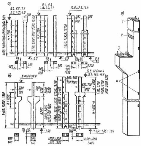 Колонны квадратного и прямоугольного сечения имеют следующие унифицированные размеры: 400х400, 400х600, 400х800, 500х500, 500х600 и 500х800 мм. У колонн двухветвевого сечения размеры приняты следующие: 400х1000, 500х1000, 500х1300.500х1400, 500х1550.600х1400, 600х1900 и 600х2400 мм.