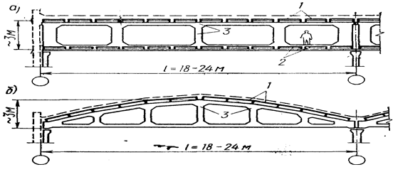 а-с параллельными поясами; б-арочная; 1-настил по верхнему поясу; 2 - настил по нижнему поясу; 3 - ферма