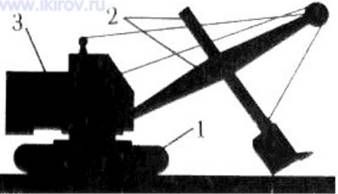 Одноковшовый экскаватор состоит из следующих основных частей: ходового устройства - 1; поворотной части - 3 и рабочего оборудования - 2.
