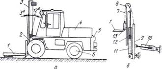 Все органы автопогрузчика (рис.: а) смонтированы на ходовой раме, которая опирается на передние ведущие двухскатные колеса 2 и задние управляемые односкатные колеса 6. В передней части рамы смонтирован грузоподъемник 3 с рабочим органом, а в задней - противовес 5. Последний обеспечивает собственную и грузовую устойчивость движущегося погрузчика. Грузоподъемник (рис.: б) включает в себя основную раму 9, которая шарнирно прикреплена к раме машины и может отклоняться от вертикали с помощью двух гидроцилиндров № на угол до 3° вперед и до 12° назад, чем обеспечивается захват грУ34 при загрузке и его устойчивое положение при транспортировании. Внутри основной рамы на катках с помощью гидроцилиндра 11 перемещается выдвижная рама 12, по которой на роликах перемещается грузовая каретка 13 с прикрепленными к ней вилами 1. Каретка подвешена на двух грузовых цепях 7, которые огибают звездочки 8 на выдвижной раме и закрепляются другим концом на основной раме.