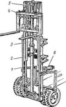 Рабочее оборудование подвешивается на грузоподъемник (рис). Он состоит из основной (неподвижной) / и выдвижной (2) рам. К выдвижной раме подвешивается каретка (4), к которой прикрепляется рабочее оборудование. Рама с кареткой поднимается при помощи гидроцилиндра (3) одностороннего действия, установленного на основной раме. При подъеме подвижной рамы одновременно по этой раме перемещается каретка. Это осуществляется благодаря тому, что каретка подвешена на двух цепях (5), один конец которых переброшен через блоки, закрепленные на верхней траверсе подвижной рамы, а второй конец закреплен на основной раме.