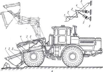 По типу ходового устройства они могут быть пневмоколесными и гусеничными. Первые имеют большие транспортные скорости, не разрушают поверхности дорог и площадок складов. Вторые позволяют развивать в 1,2...1,5 раза большее, чем у колесных, усилие при внедрении в грунт силой тяги, а также обладают большой маневренностью вследствие возможности разворота на месте, что сокращает продолжительность цикла на 8...25%и повышает производительность на 20...30%. В качестве базовых машин для погрузчиков применяют специальные пневмоколесные шасси, промышленные тракторы погрузочных модификаций или тракторы общего назначения обеспечивает разгрузку ковша со стороны разрабатываемого материала. Он состоит из пневмоколесного трактора с шарнирно сочлененной рамой и ковша 1, укрепленного на стреле 4 и управляемого рычажными механизмами 2,3 с помощью гидроцилиндров 5 двухстороннего действия. Стрелу поднимают и опускают двумя гидроцилиндрами 6. Рычажная система обеспечивает постоянное положение заполненного ковша при его подъеме, что исключает потери загруженного материала.